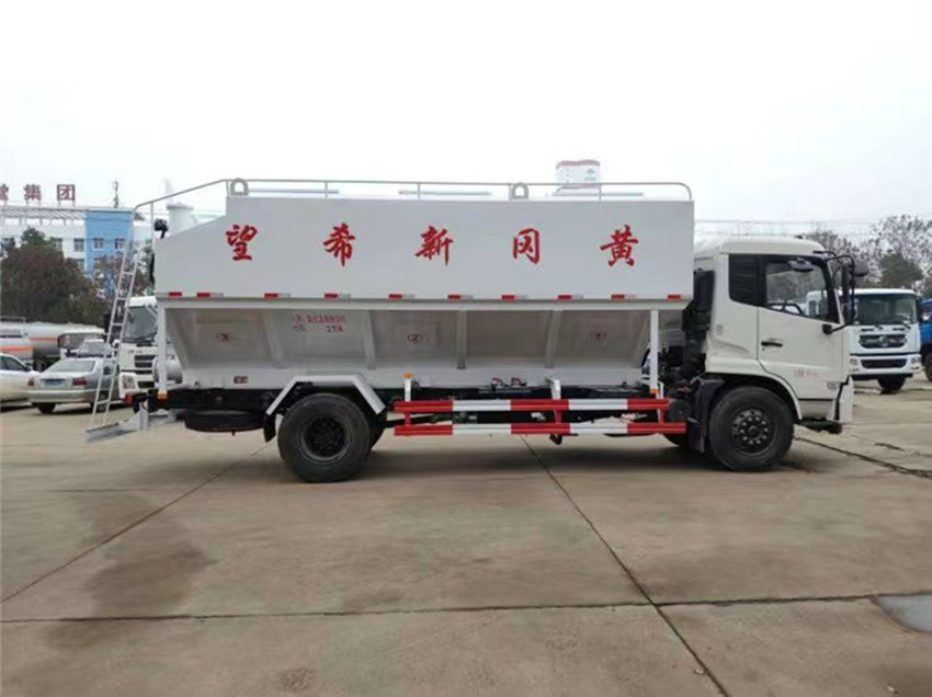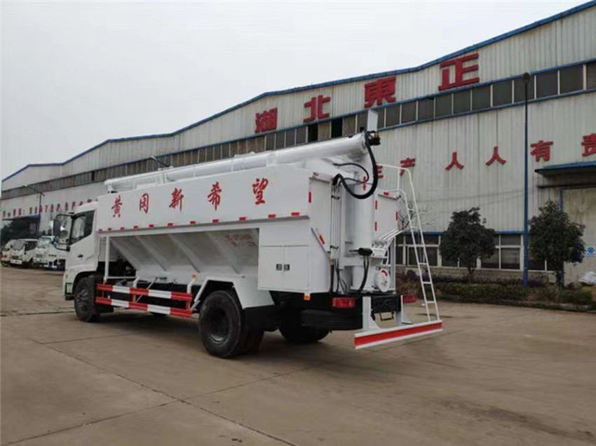散裝飼料運輸車,散裝飼料車的飼料罐架設(shè)在卡車的底盤上,罐頂開有進(jìn)料口.頂部的一根螺旋輸送卸料管(俗稱卸料絞龍)則可自由回轉(zhuǎn)和抬升,抬升的仰角可達(dá)60度。運輸時,頂部的螺旋管平臥在罐頂;卸料時則抬起,使管端的出料口與畜禽飼養(yǎng)場貯料罐頂部的進(jìn)料門相接,駕駛室內(nèi)裝有操縱裝置(操縱裝置也可裝置在罐體尾部),卸料時通過車底的動力輸出軸和減速器來驅(qū)動螺旋,以完成卸料。