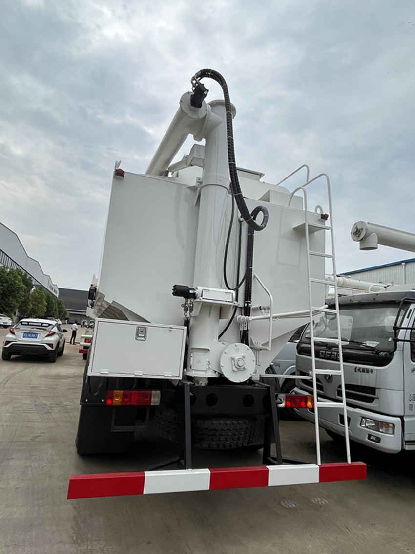 散裝飼料運(yùn)輸車(chē),散裝飼料車(chē)的飼料罐架設(shè)在卡車(chē)的底盤(pán)上,罐頂開(kāi)有進(jìn)料口.頂部的一根螺旋輸送卸料管(俗稱(chēng)卸料絞龍)則可自由回轉(zhuǎn)和抬升,抬升的仰角可達(dá)60度。運(yùn)輸時(shí),頂部的螺旋管平臥在罐頂;卸料時(shí)則抬起,使管端的出料口與畜禽飼養(yǎng)場(chǎng)貯料罐頂部的進(jìn)料門(mén)相接,駕駛室內(nèi)裝有操縱裝置(操縱裝置也可裝置在罐體尾部),卸料時(shí)通過(guò)車(chē)底的動(dòng)力輸出軸和減速器來(lái)驅(qū)動(dòng)螺旋,以完成卸料。
